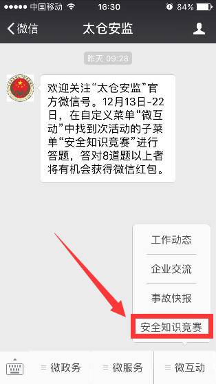 ②进入公众号,点击菜单【微互动】中的【安全知识竞赛】参与活动。