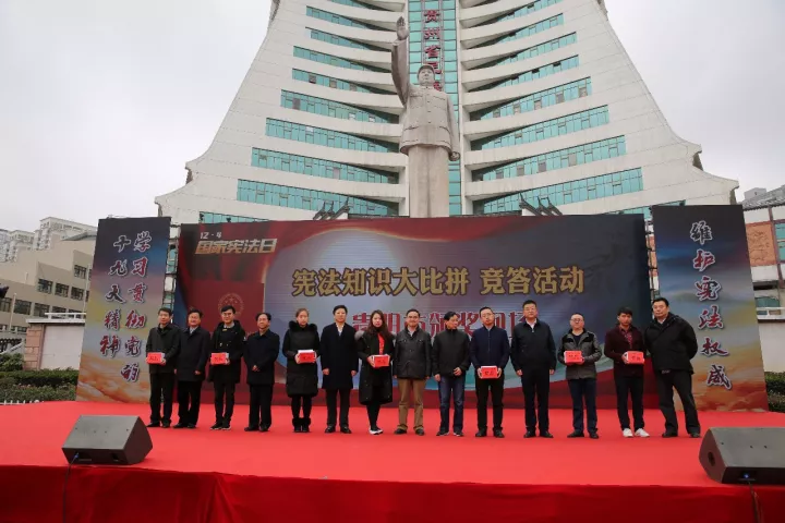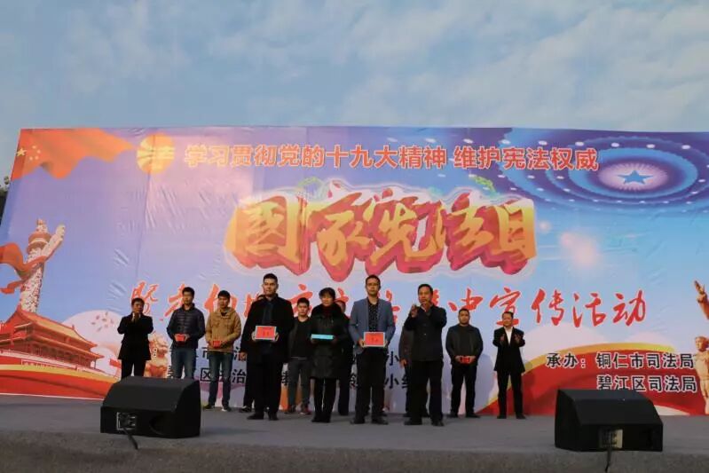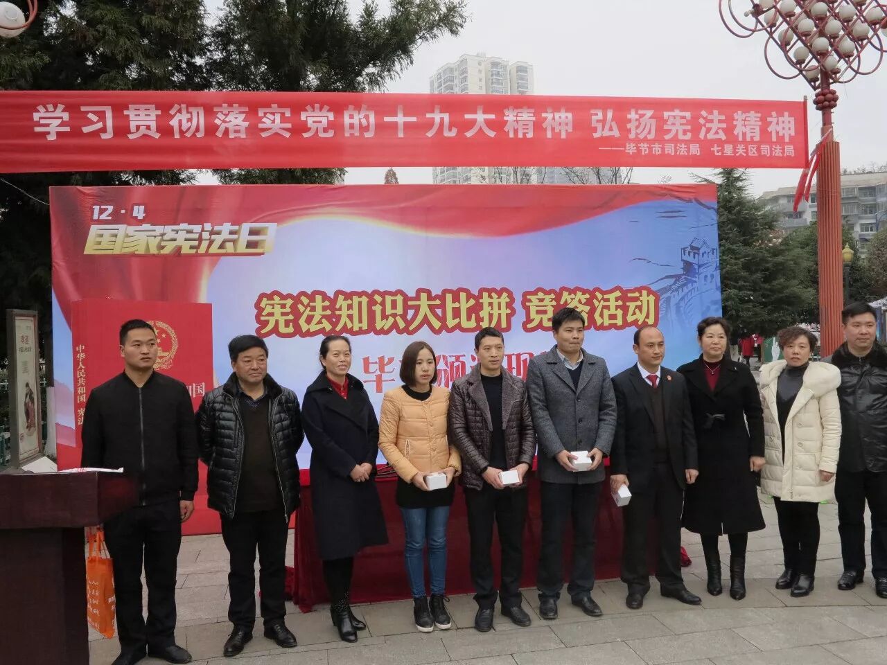 11月24日至30日,省委宣传部和省司法厅通过“黔微普法”微信平台在全省范围同步开展了贵州省“宪法知识大比拼”闯关竞答线上活动。竞答活动共设九关,每通过一关即可获得相应的宪法令牌,答题正确率越高获得的宪法令牌就越多,还有抽取微信红包的机会。连续七天的闯关竞答,最终将参与者宪法令牌收集最多且闯关答题耗时最短的累计成绩按照各市州分别进行排名,并于12月4日宪法日当天同步为本地区闯关竞答排名前十的获奖者颁奖。此次活动全省共有240078名手机用户参与,掀起了学习宪法的热潮。其中,遵义市参与人数最多,来自安顺市的沈红星以99.47%的答题正确率并获188块宪法令牌的好成绩在全省排名第一。