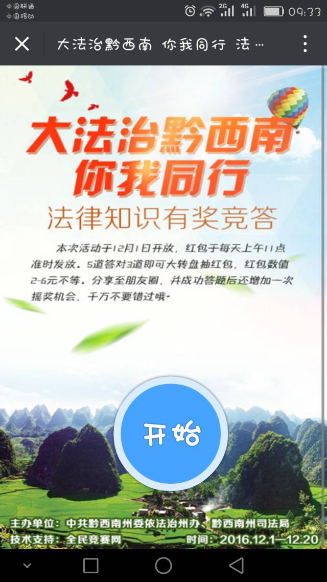 2016年12月1日至12月20日,网友可通过@法治黔西南微信公众号“有奖竞答”菜单进入答题,活动随机产生5题,用户答对3题即可参加转盘抽取红包。网友答题完毕后,可将自己的成绩附带手机答题页面分享到朋友圈,欢迎大家转发活动情况,有意外惊喜哦!