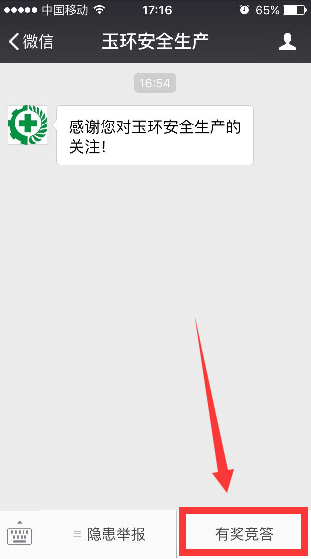 玉环安全生产 隆重推出答题抢红包活动啦~~ 是的,你没有看错!!! 每天上午12点整!!! 赶快转发朋友圈 通知你们的亲朋好友 一起来抢~~ 另:活动10月24日正式启动哦! 活动名称宣传《安全生产法》实施两周年暨《浙江省安全生产条例》正式实施微信有奖竞答答题抢红包 10月24日-10月28日 每天上午12点 玉环安全生产活动步骤第一步搜索微信公众号关注我们 玉环安全生产 第二步 特别提醒:5题答对3题就能抢红包了哦~准备好了吗?