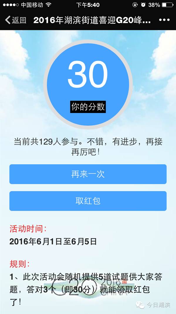 为迎接杭州G20峰会,进一步提高湖滨街道(社区)公众科学文明素质、促进社会和谐,“今日湖滨”特推出“喜迎G20峰会”微信知识有奖竞答活动。就在6月1日~6月5日哦!