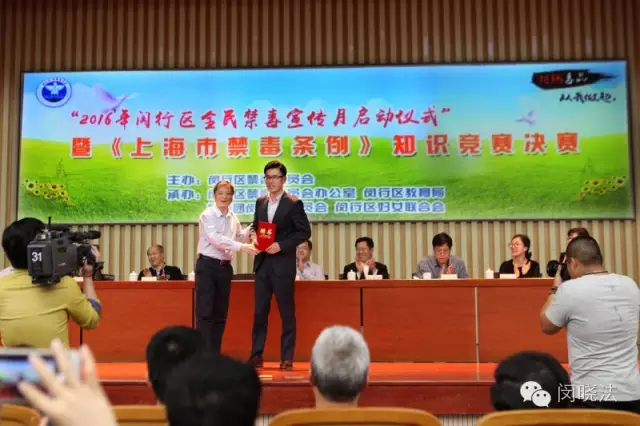 与会领导还为荣获2014-2015年度上海市禁毒工作示范社区和上海市禁毒工作先进集体、先进个人颁奖;中学生代表向全区中小学生和青少年朋友发出禁毒倡议;来自14个街镇(莘庄工业区)和全区13所中学的27支参赛队,分别代表社区组和学校组角逐禁毒知识竞赛决赛集体一、二、三等奖。