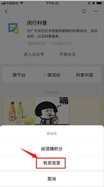 2、点击底部菜单“微活动” —“有奖竞答”进入活动页面参与活动。