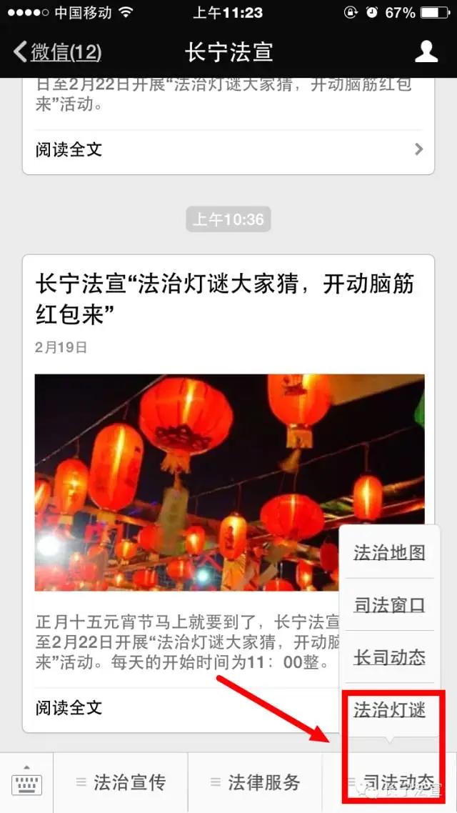 点击菜单【司法动态】中【法治灯谜】即可进行答题!看下图!