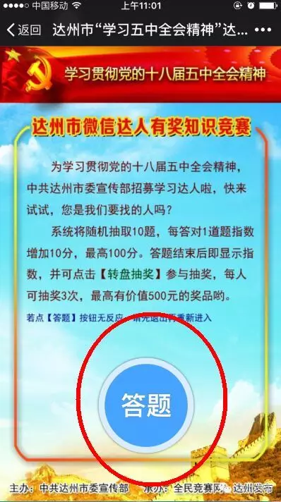 参赛人员可通过关注“达州发布”微信公众号,点击“知识竞赛”或回复“答题”即可参与活动。系统将自动从党的十八届五中全会精神试题库中随机抽取10题,让参赛者微信答题,每答对1题得10分,最高100分,答题结束后立即显示分数。